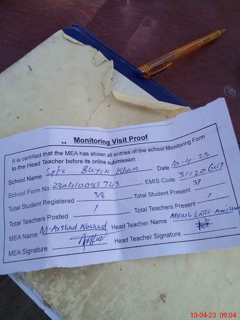 | Attendance Register | Head Teacher | MEA with School | Visit Proof |