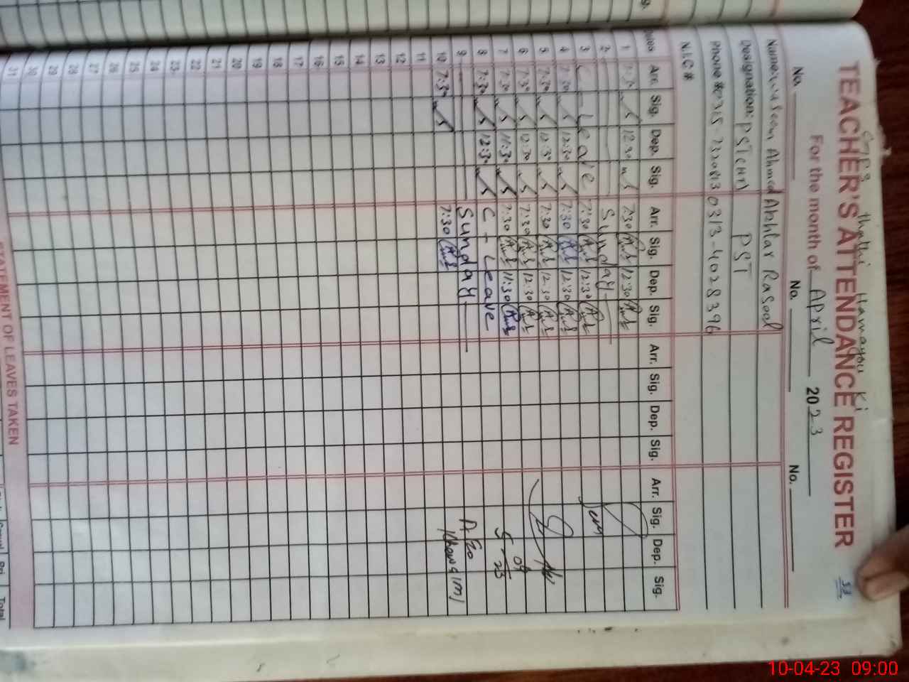 | CNIC | Full Name | Designation | R/C | Absence During Last Calender Month |