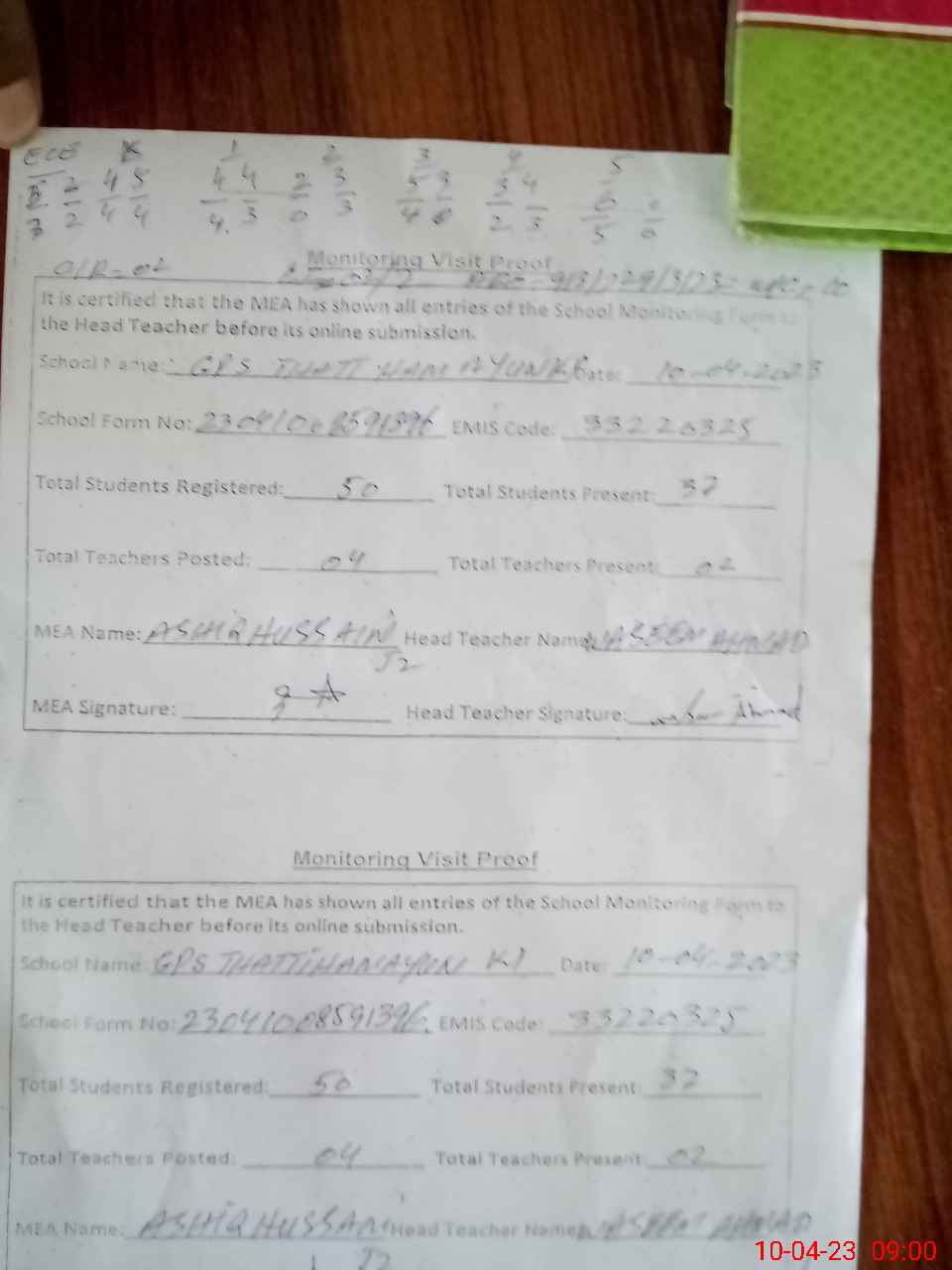 | Attendance Register | Head Teacher | MEA with School | Visit Proof |