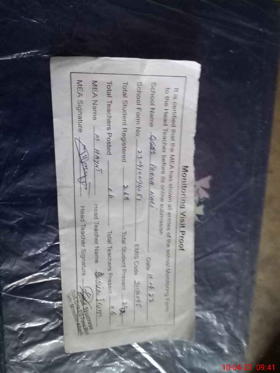 | Attendance Register | Head Teacher | MEA with School | Visit Proof |