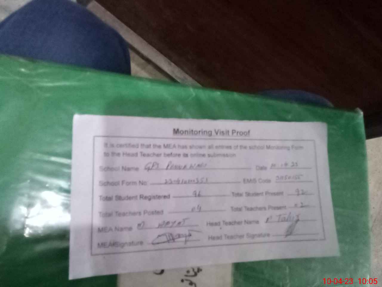 | Attendance Register | Head Teacher | MEA with School | Visit Proof |
