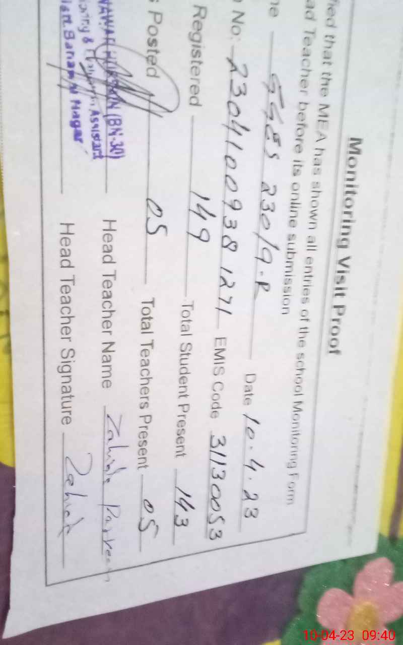 | Certified that this School was Inspected by the Undersigned MEA/DMO Today and the Information Stated Above is as Per Record. | |||||