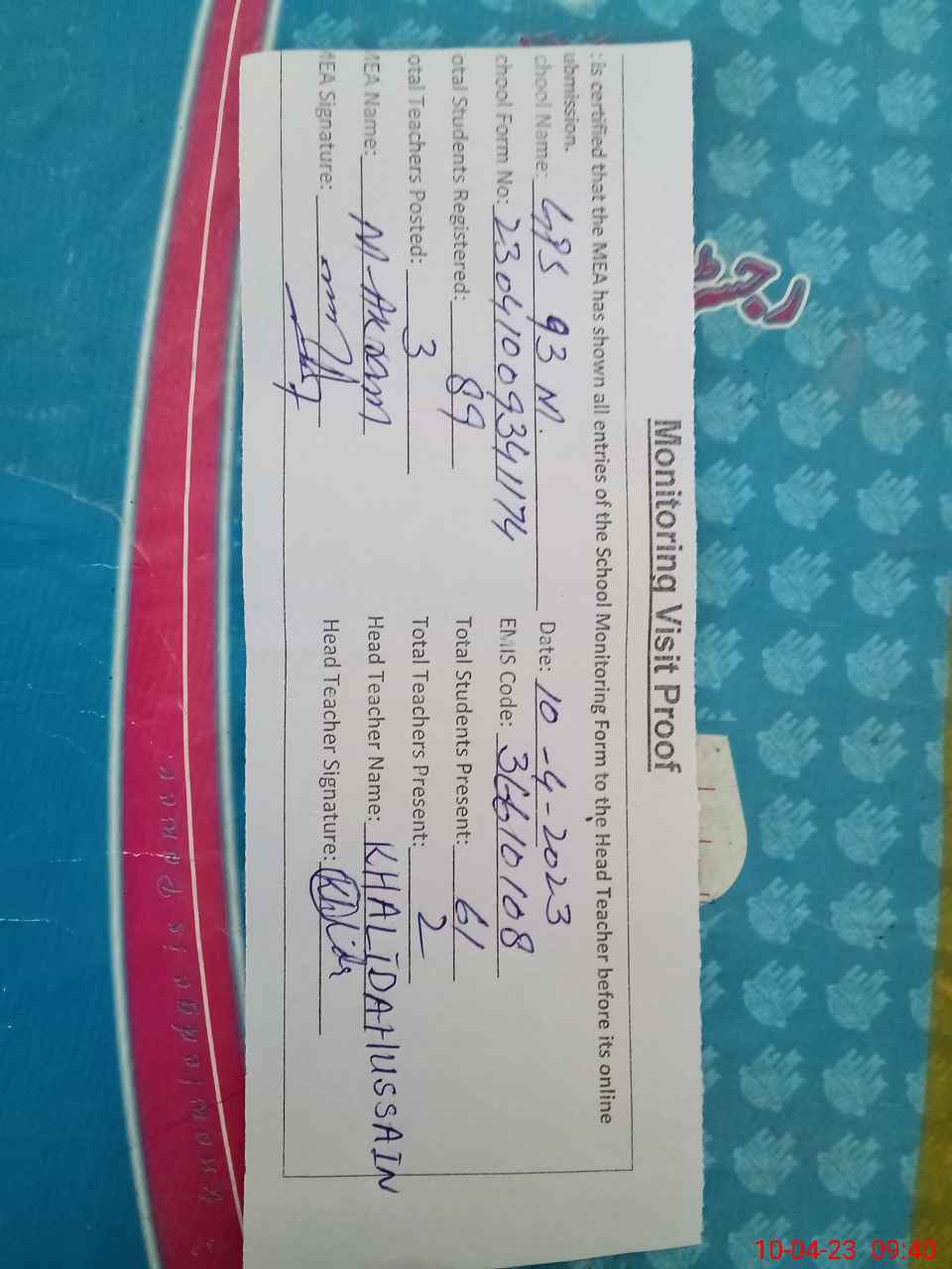 | Attendance Register | Head Teacher | MEA with School | Visit Proof |