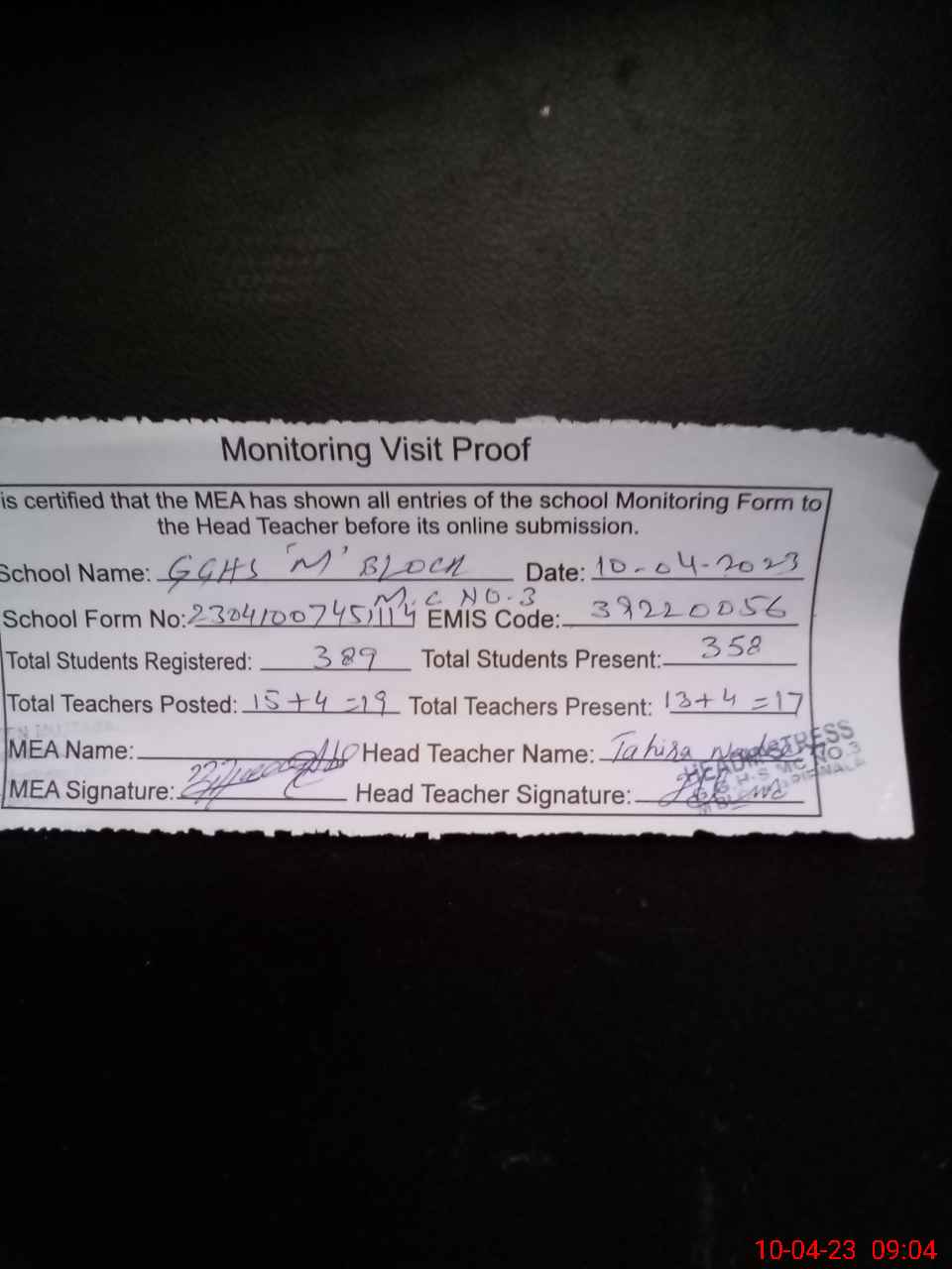 | Attendance Register | Head Teacher | MEA with School | Visit Proof |