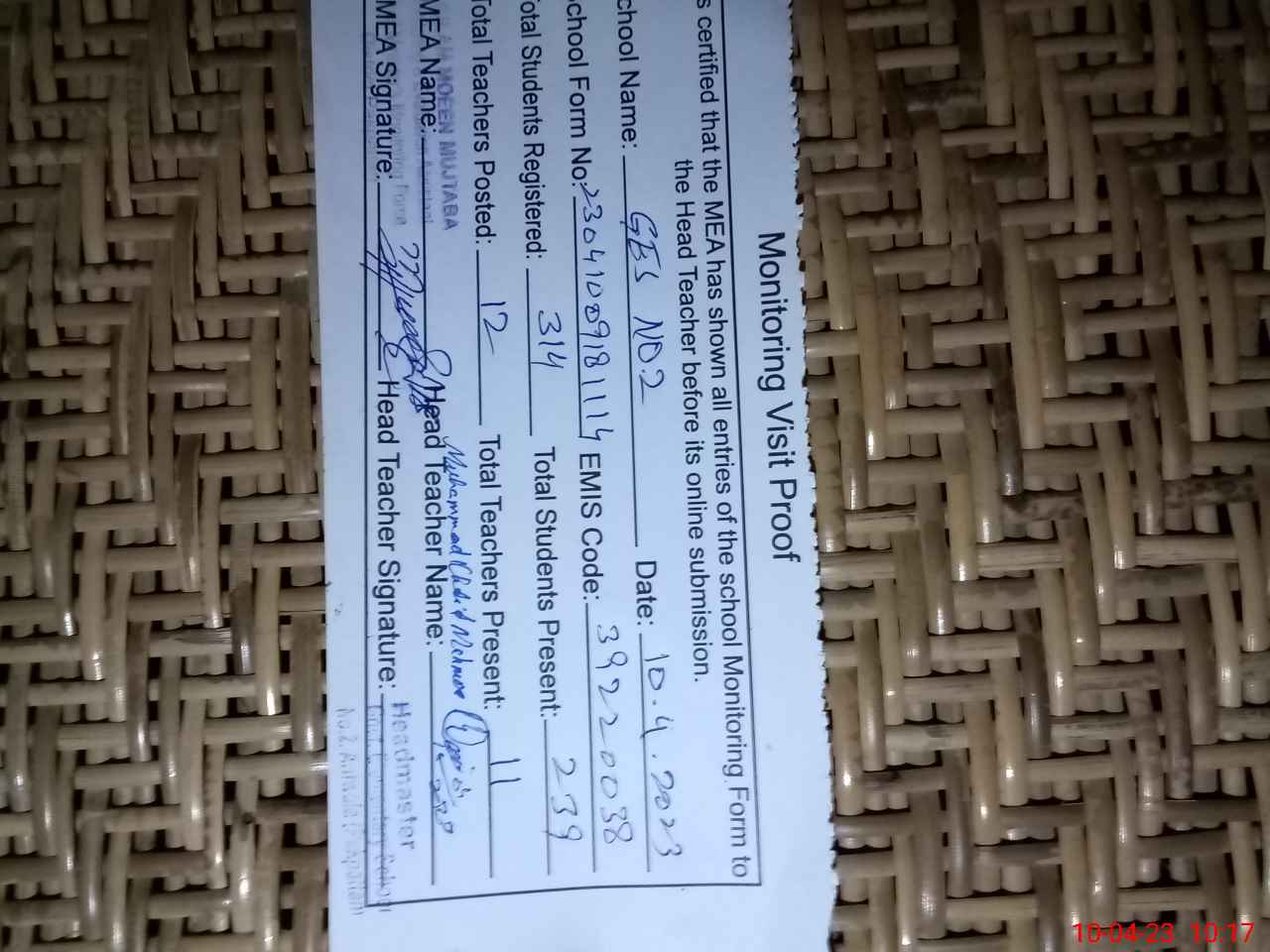 | Attendance Register | Head Teacher | MEA with School | Visit Proof |