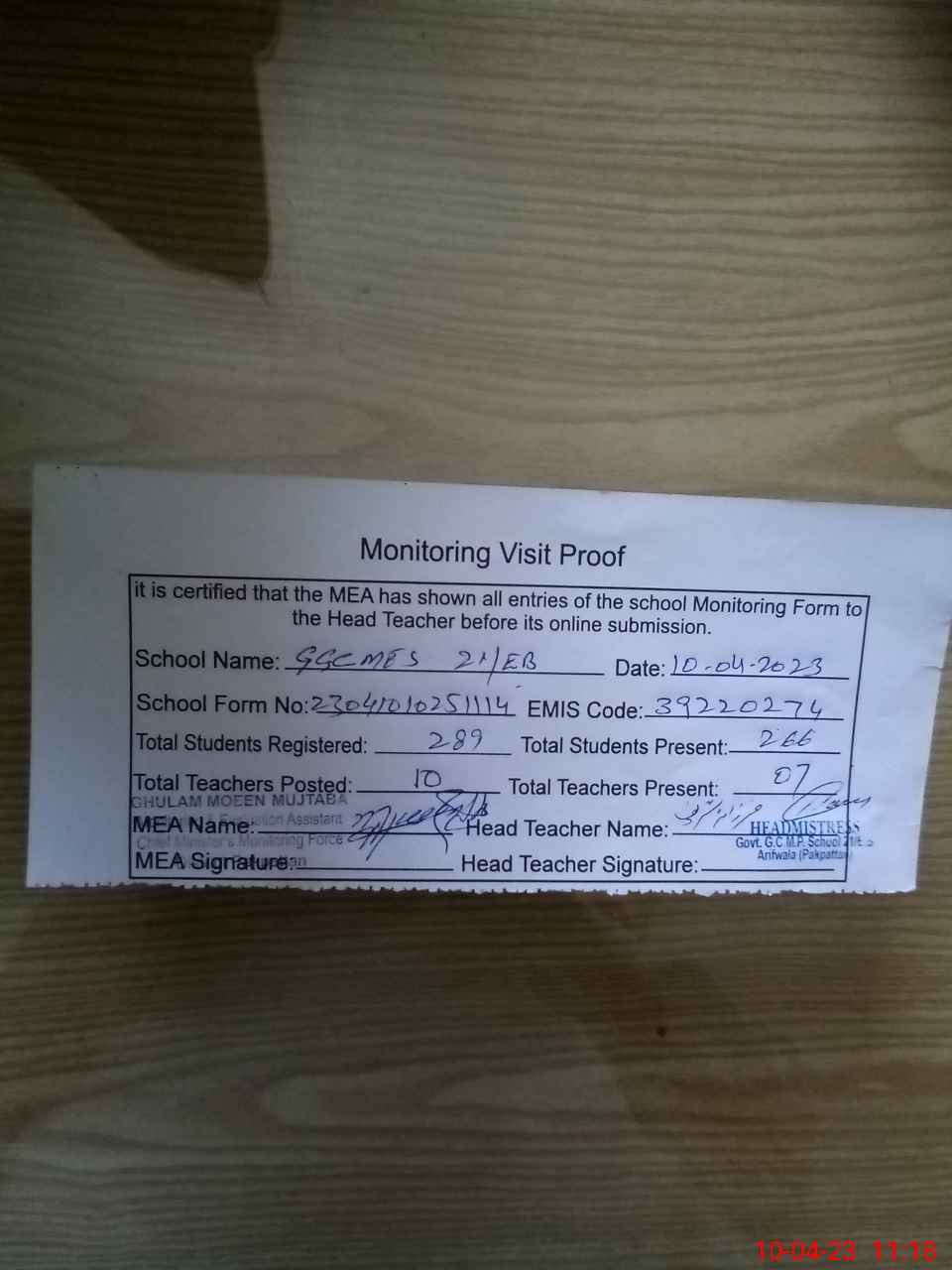 | Monitoring Date: 10-04-2023 | Start Time: 10-04-2023 10:25 AM | End Time: 10-04-2023 11:19 AM | Name of MEA: Gh**** Mu**** Mu**** (R**** | |