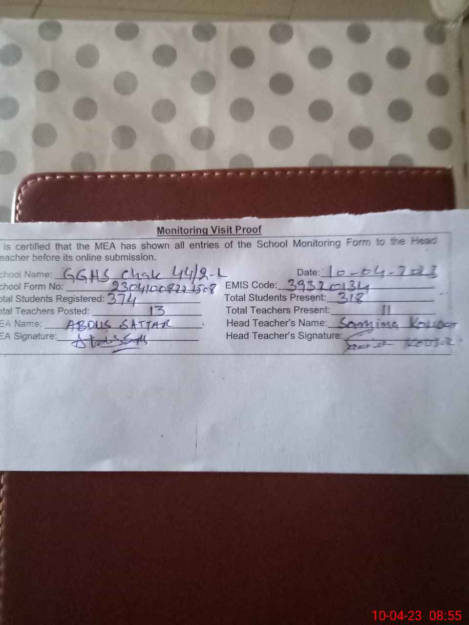 | EMIS Code: 39320134 | Name of School: GGHS CHAK NO.44/2-L | |||