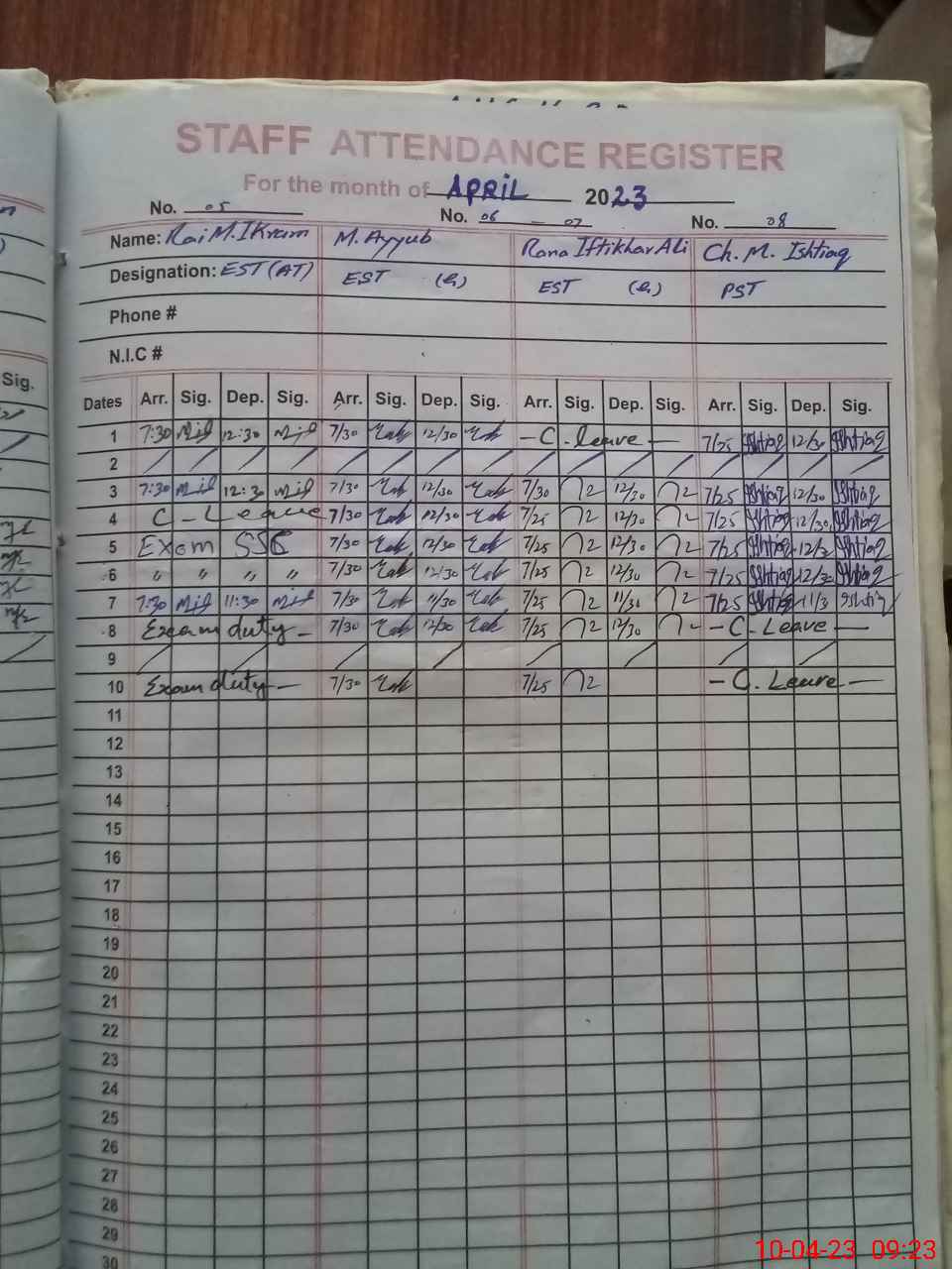 | CNIC | Full Name | Designation | R/C | Absence During Last Calender Month |