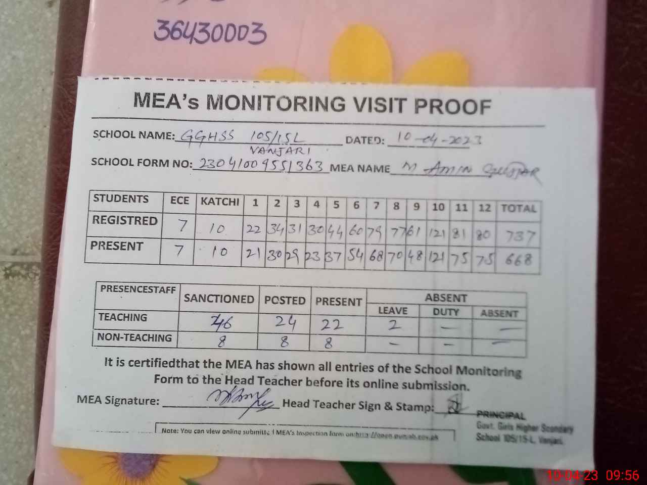 | Attendance Register | Head Teacher | MEA with School | Visit Proof |