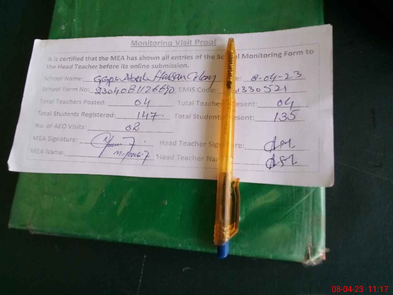 | Attendance Register | Head Teacher | MEA with School | Visit Proof |
