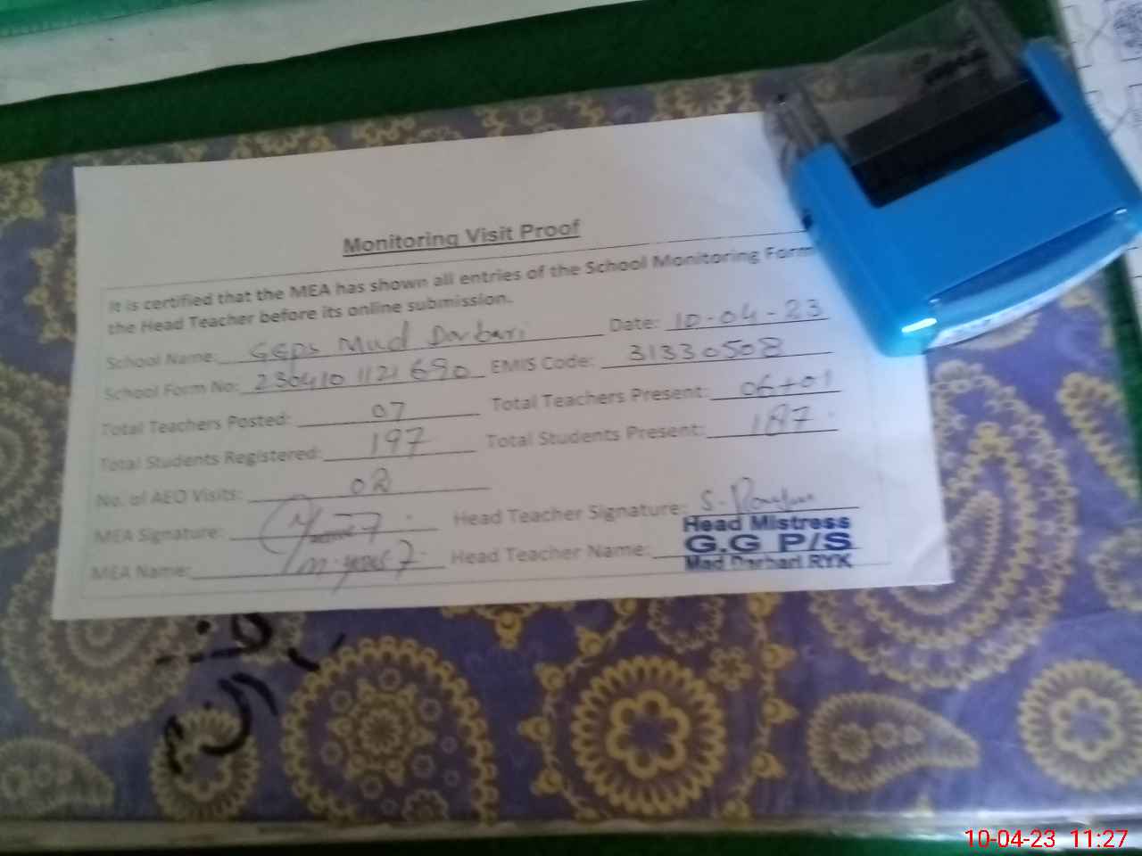 | Attendance Register | Head Teacher | MEA with School | Visit Proof |