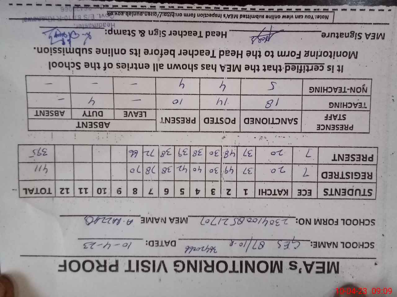 | Attendance Register | Head Teacher | MEA with School | Visit Proof |