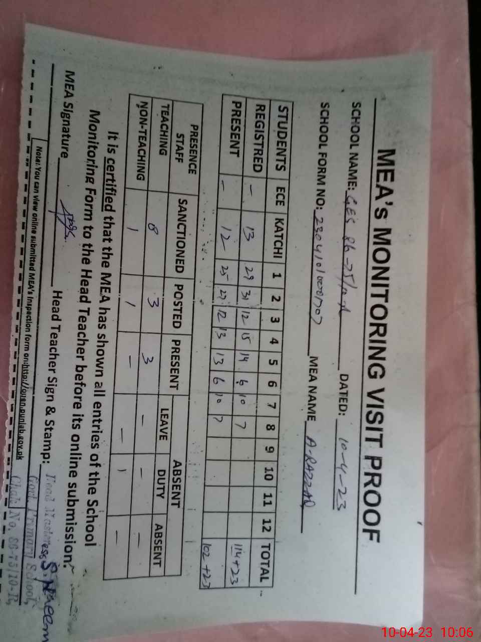 | Attendance Register | Head Teacher | MEA with School | Visit Proof |