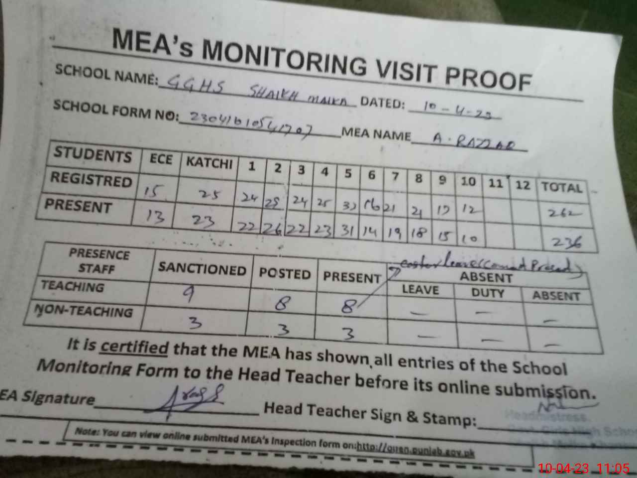 | Attendance Register | Head Teacher | MEA with School | Visit Proof |