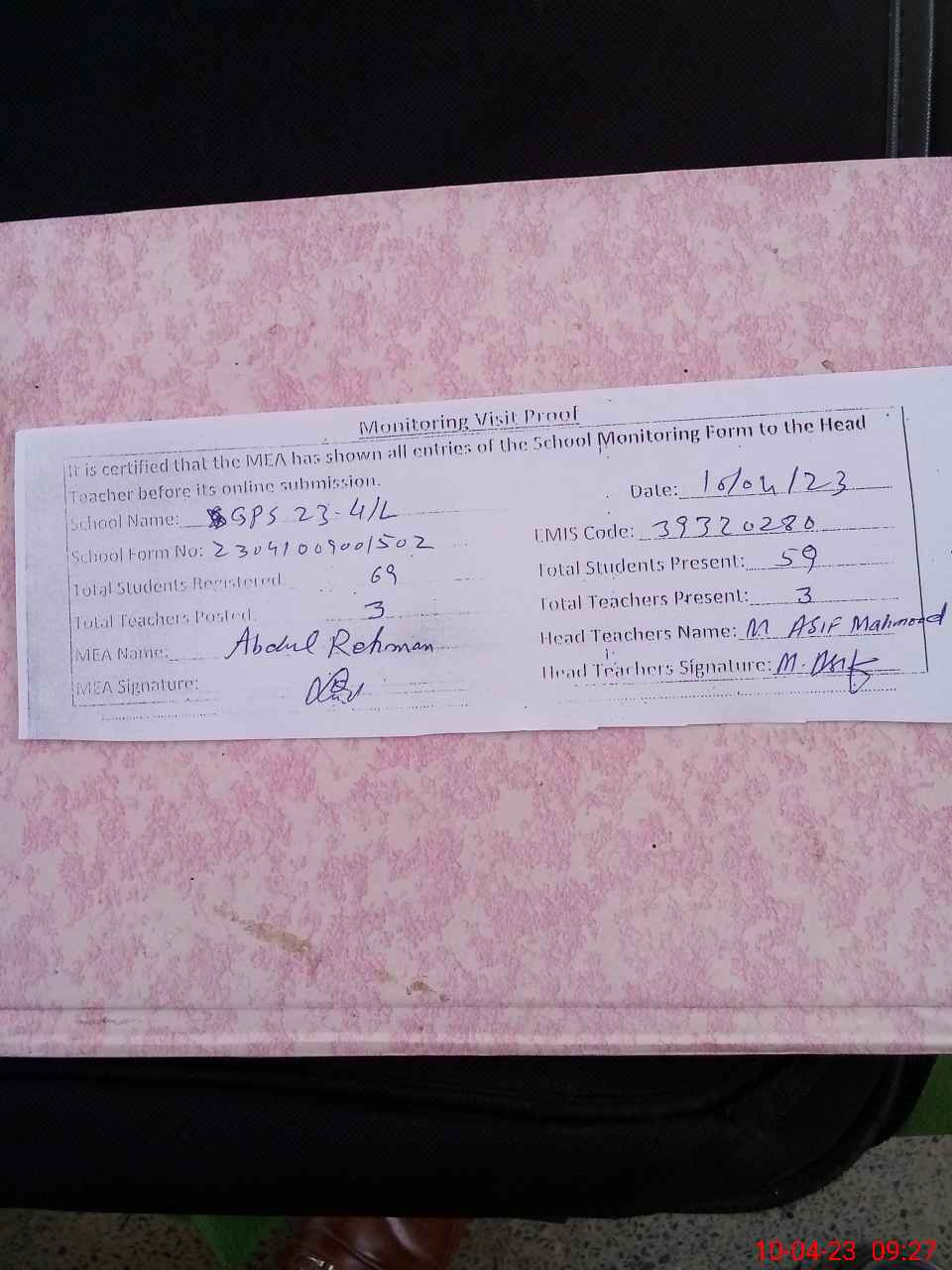 | Attendance Register | Head Teacher | MEA with School | Visit Proof |
