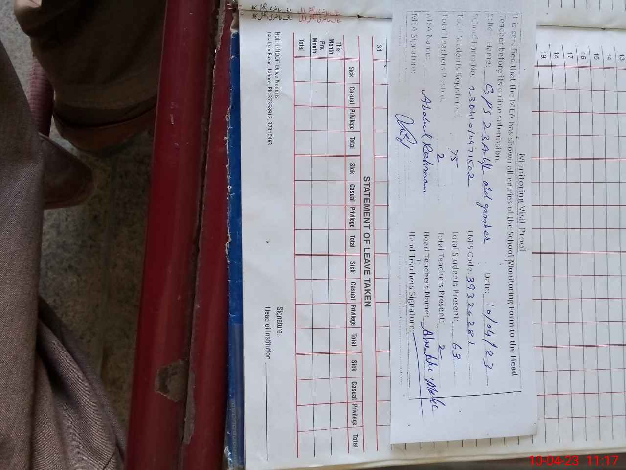 | Attendance Register | Head Teacher | MEA with School | Visit Proof |