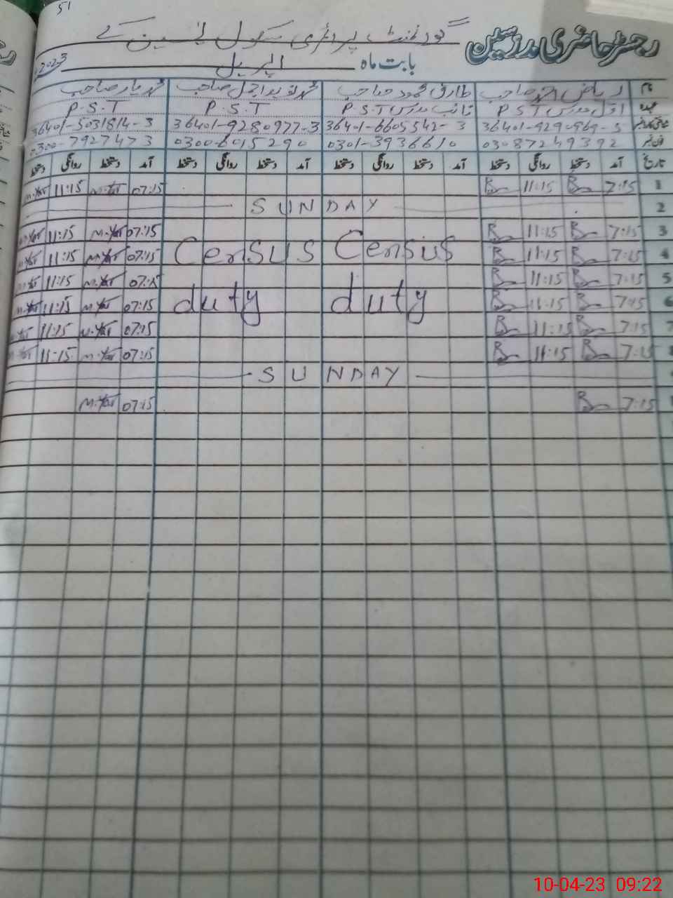 | Name: RI**** AH**** Designation: (School Headmaster's/Headmistress's) PST Phone/Cell Number: 03**** |