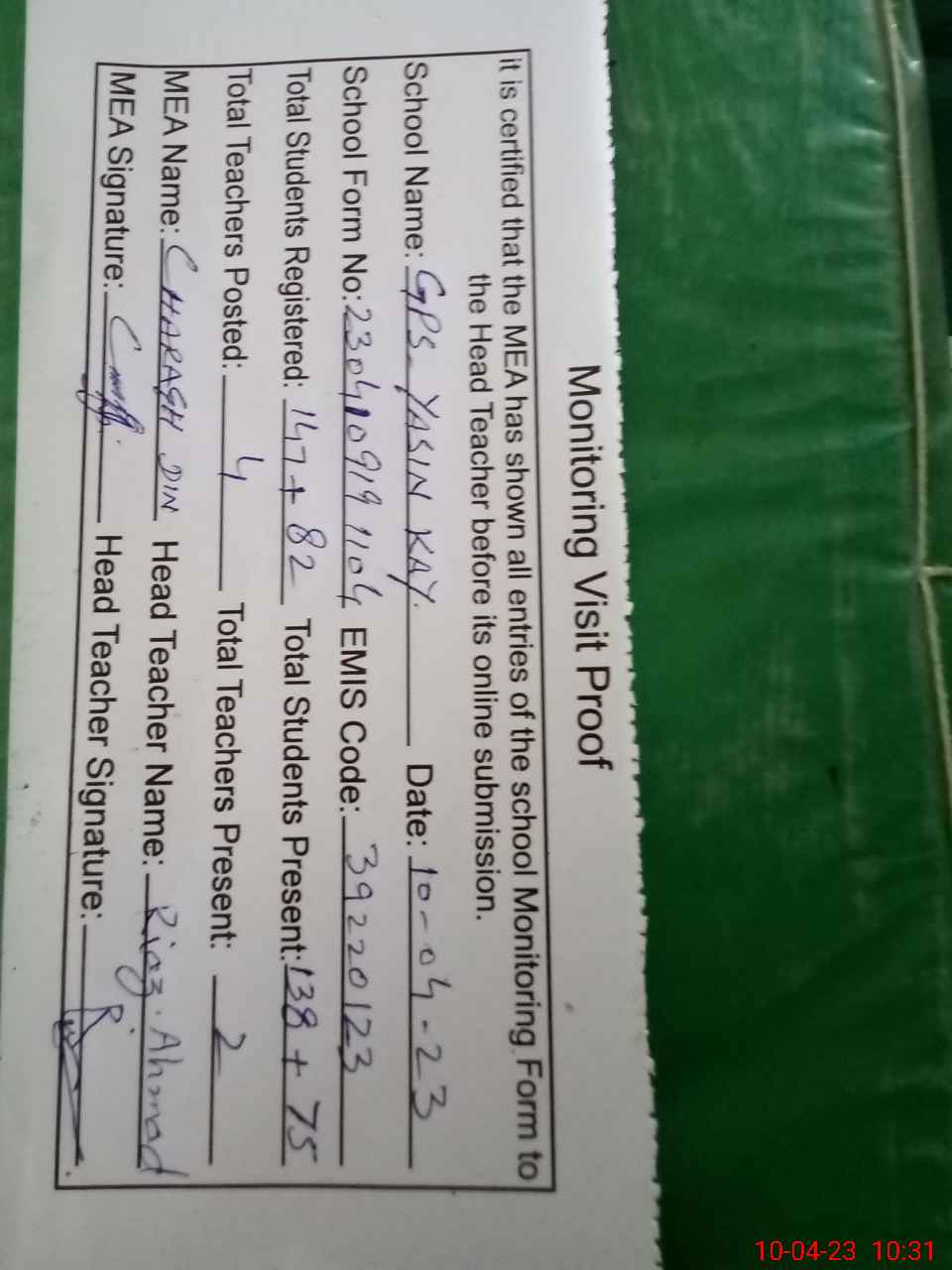 | Attendance Register | Head Teacher | MEA with School | Visit Proof |