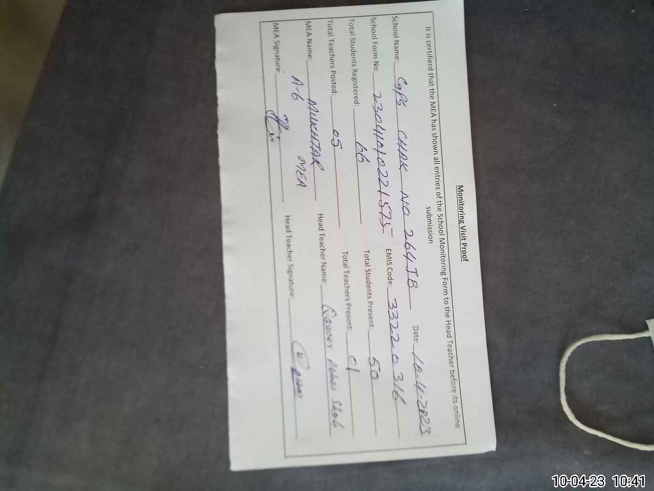 | Attendance Register | Head Teacher | MEA with School | Visit Proof |