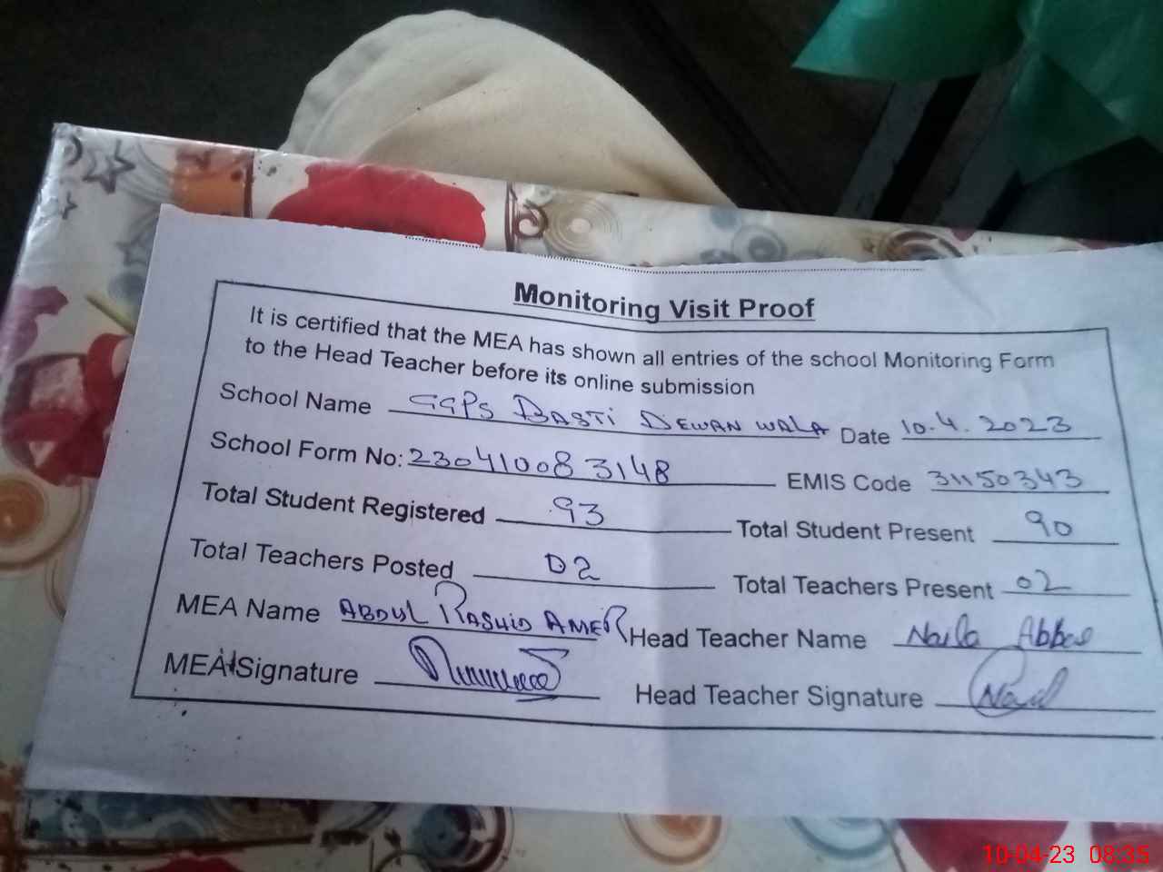 | Certified that this School was Inspected by the Undersigned MEA/DMO Today and the Information Stated Above is as Per Record. | |||||