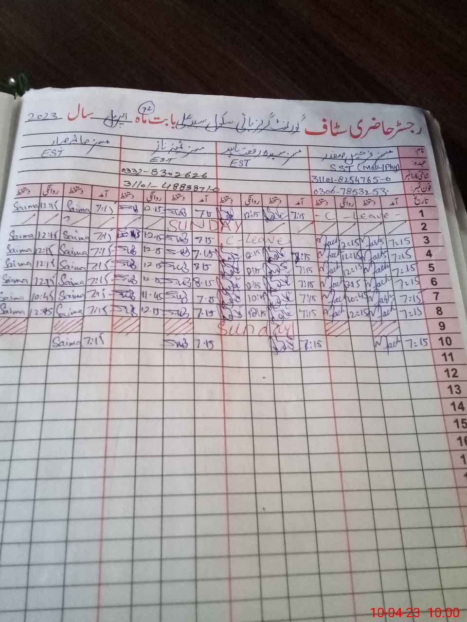 | Name: Sa**** Na**** Designation: (School Headmaster's/Headmistress's) SST. Art Phone/Cell Number: 03**** |