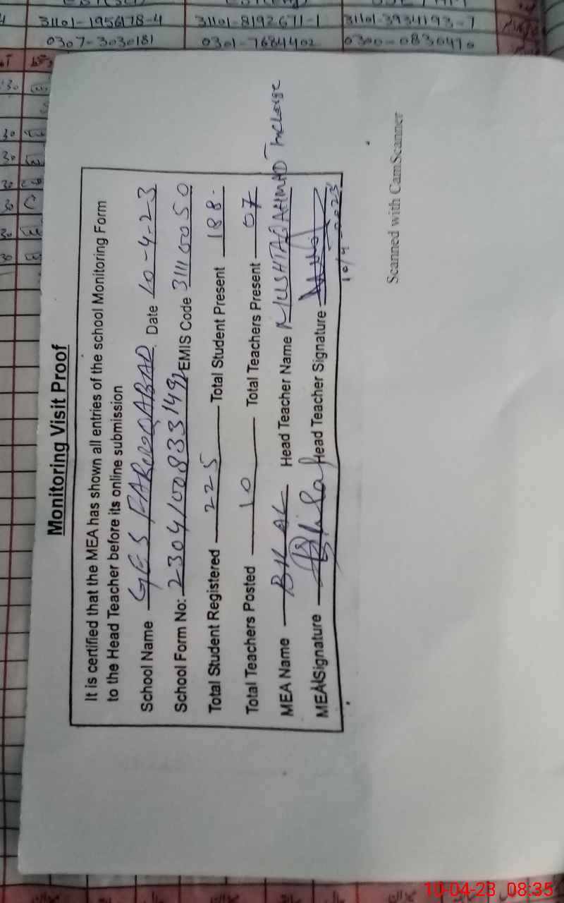 | Attendance Register | Head Teacher | MEA with School | Visit Proof |