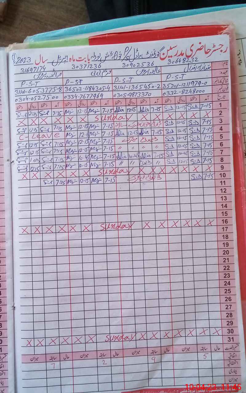 | CNIC | Full Name | Designation | R/C | Absence During Last Calender Month |