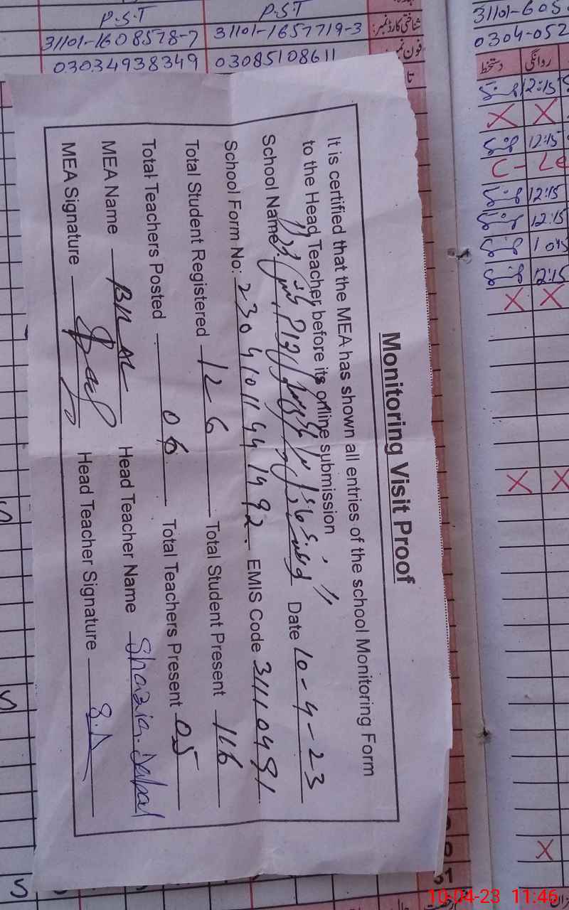 | Name: SA**** PE**** Designation: (School Headmaster's/Headmistress's) PST Phone/Cell Number: 03**** |