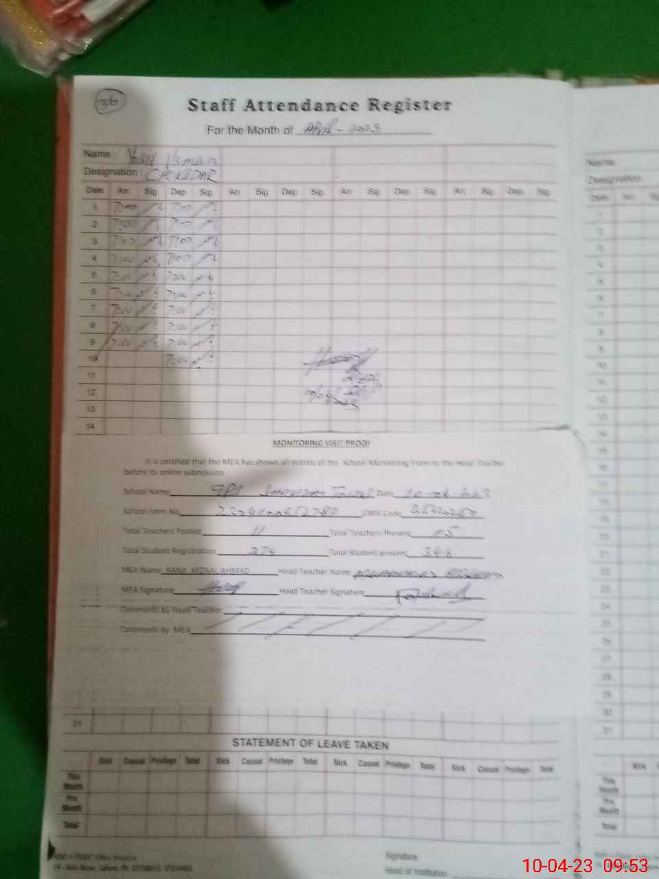 | Attendance Register | Head Teacher | MEA with School | Visit Proof |