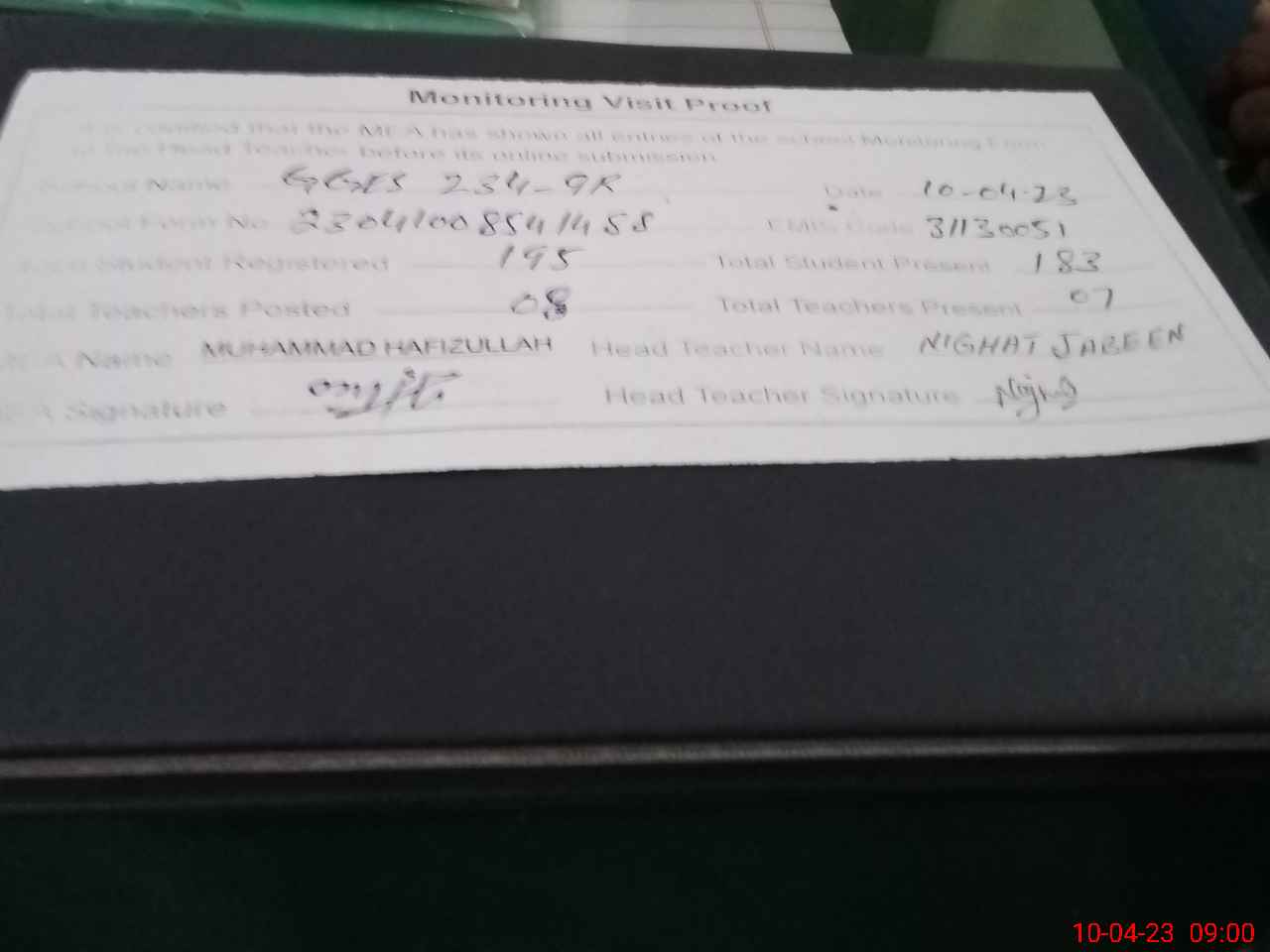 | Attendance Register | Head Teacher | MEA with School | Visit Proof |