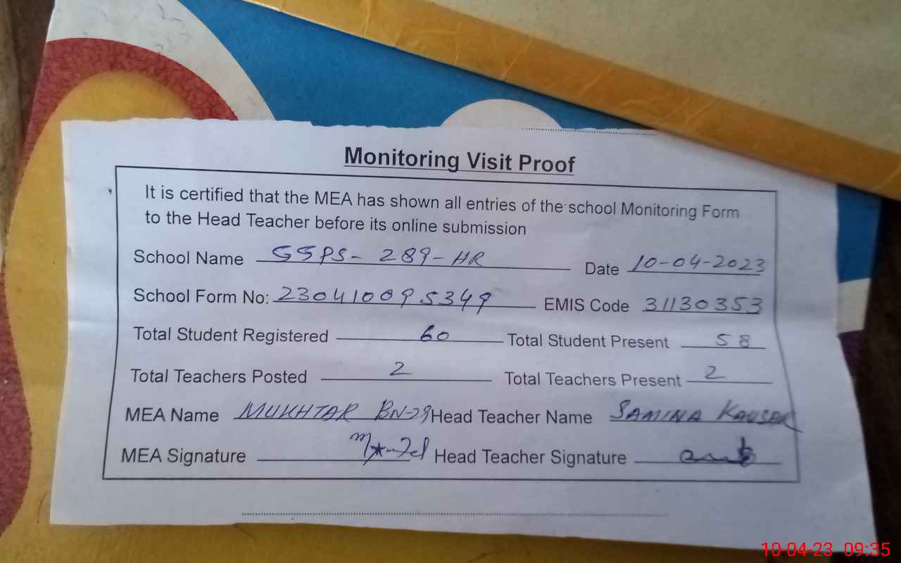 | EMIS Code: 31130353 | Name of School: GGPS CHAK NO 289 HR | |||