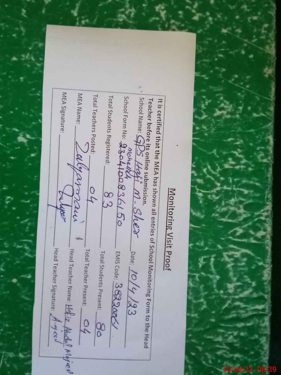 | Attendance Register | Head Teacher | MEA with School | Visit Proof |