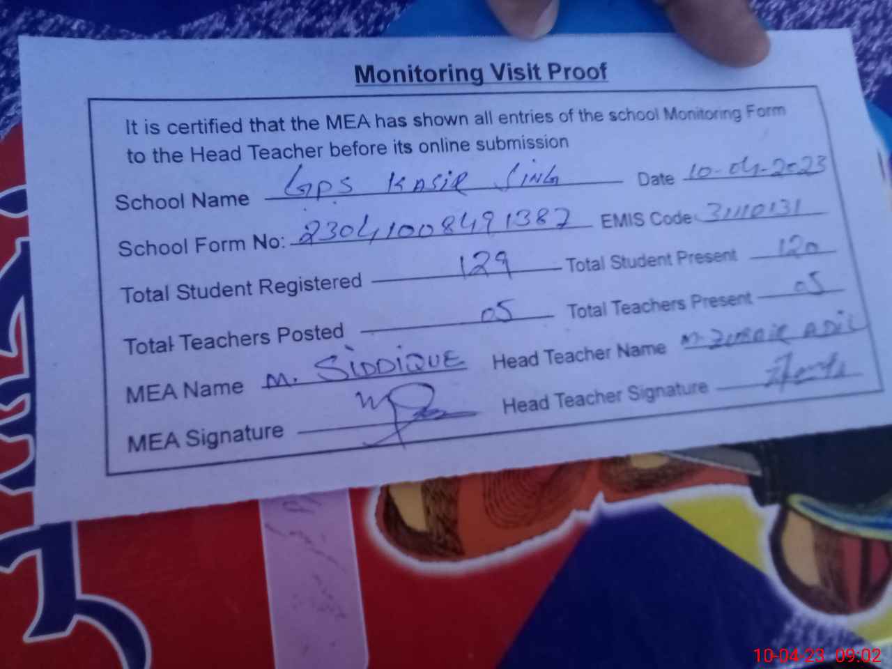 | EMIS Code: 31110131 | Name of School: GPS KASIR SINGH | |||