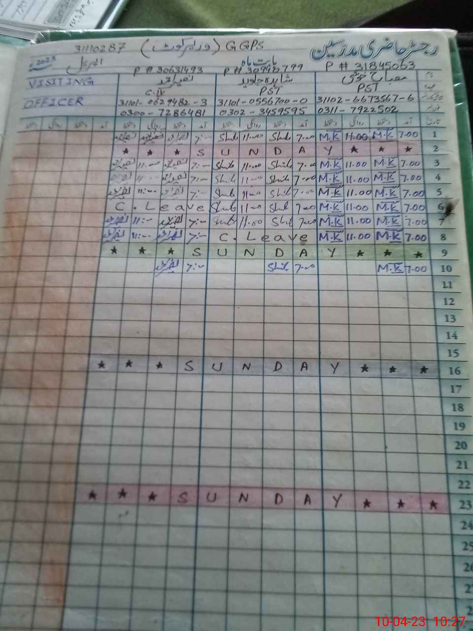| CNIC | Full Name | Designation | R/C | Absence During Last Calender Month |