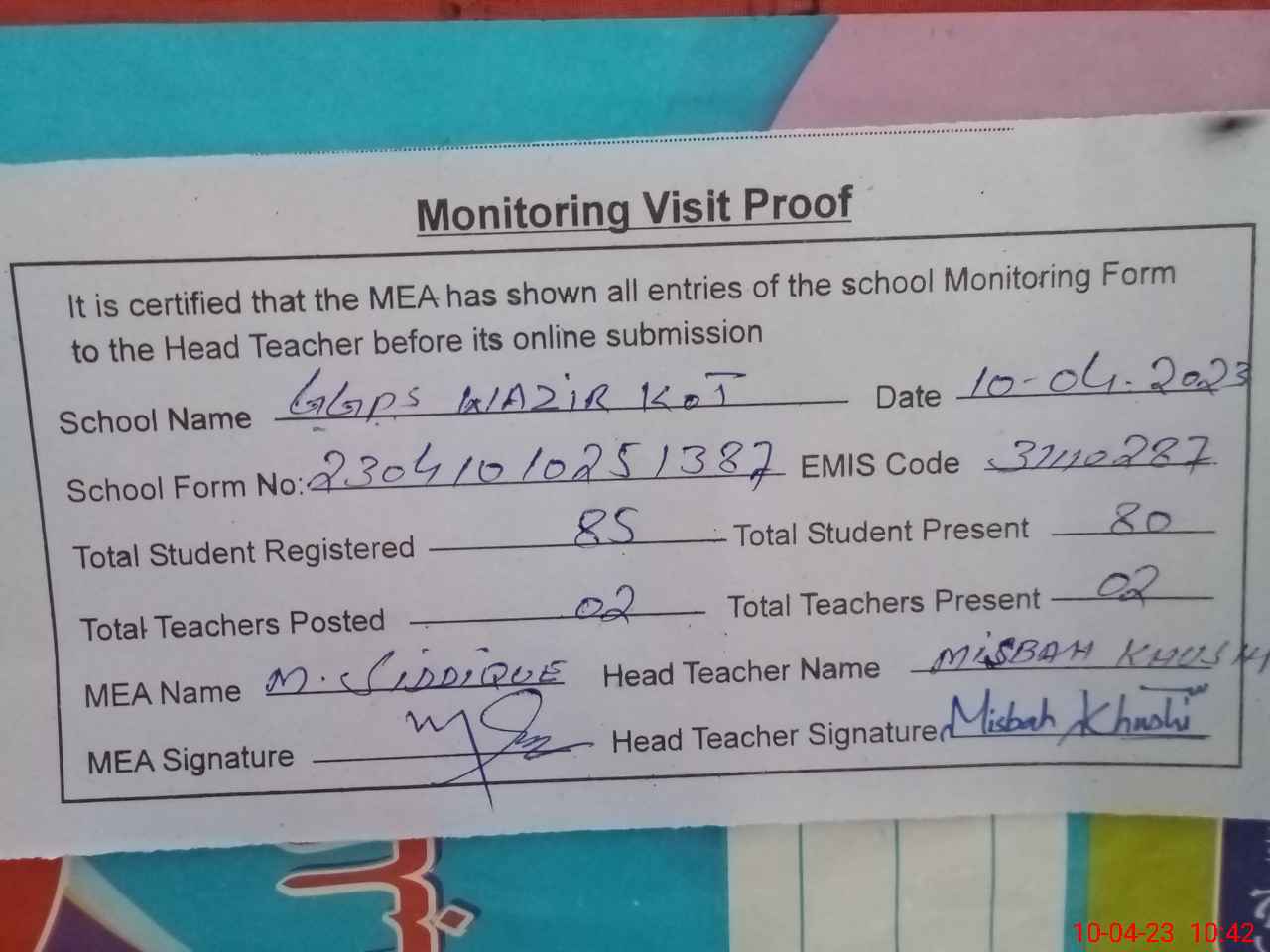 | Attendance Register | Head Teacher | MEA with School | Visit Proof |