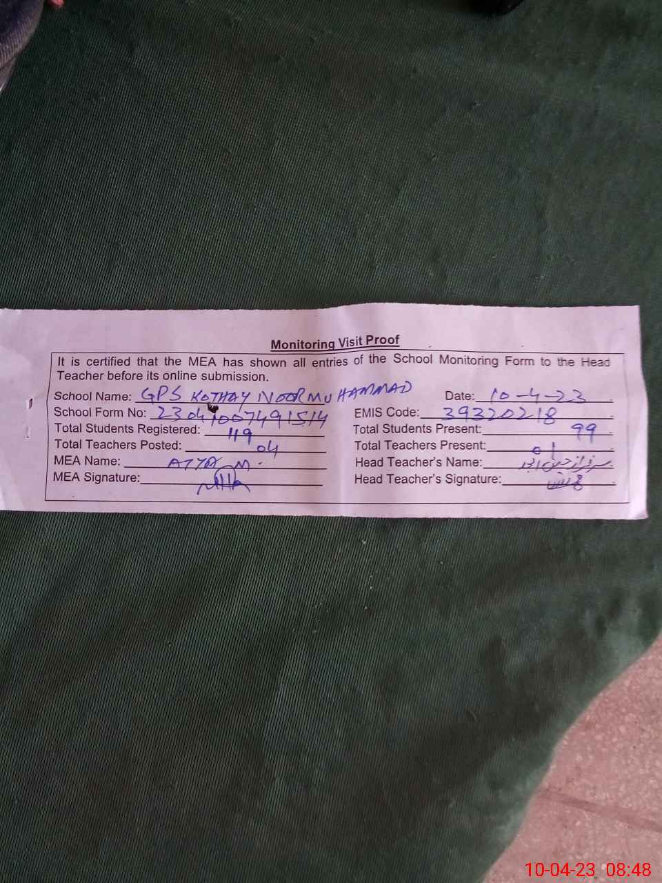 | Attendance Register | Head Teacher | MEA with School | Visit Proof |