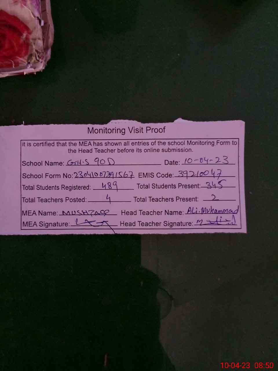 | Attendance Register | Head Teacher | MEA with School | Visit Proof |
