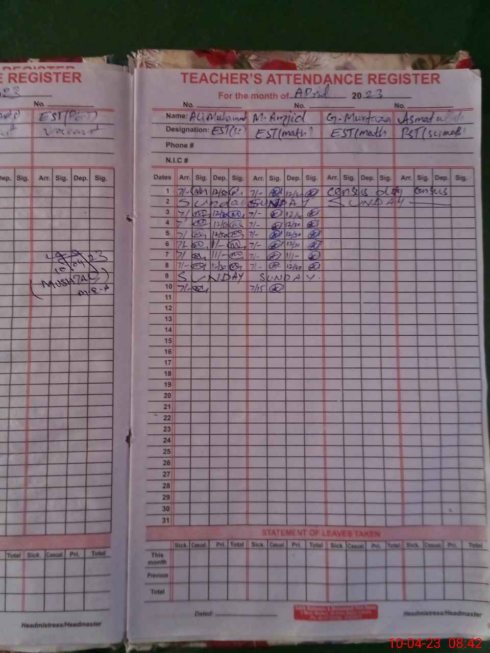 | CNIC | Full Name | Designation | R/C | Absence During Last Calender Month |