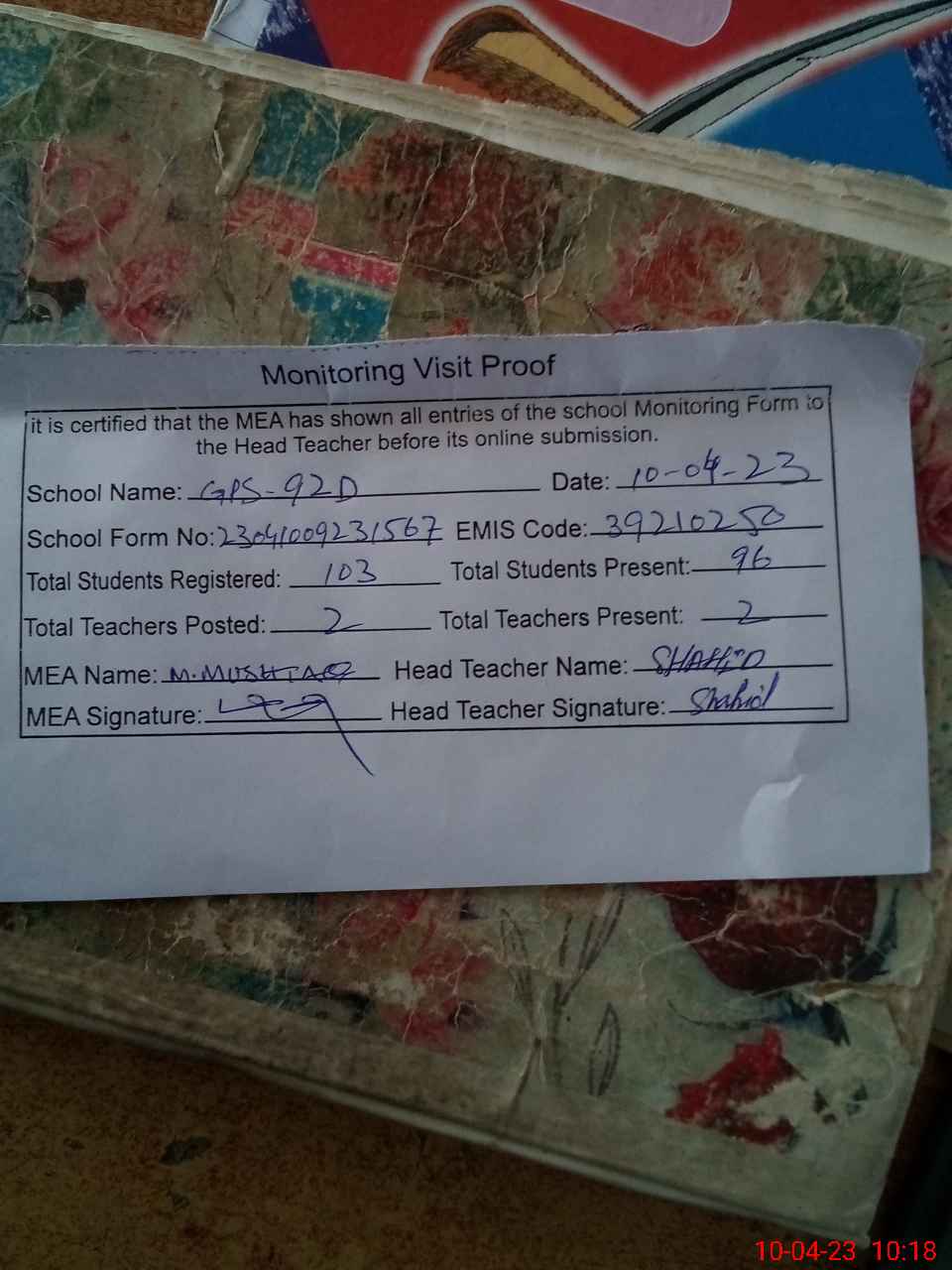 | Attendance Register | Head Teacher | MEA with School | Visit Proof |