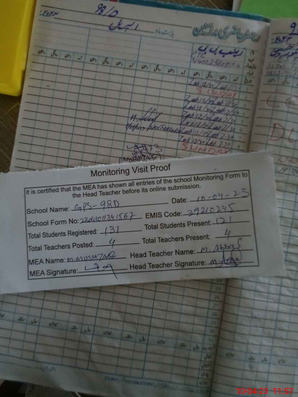 | Attendance Register | Head Teacher | MEA with School | Visit Proof |