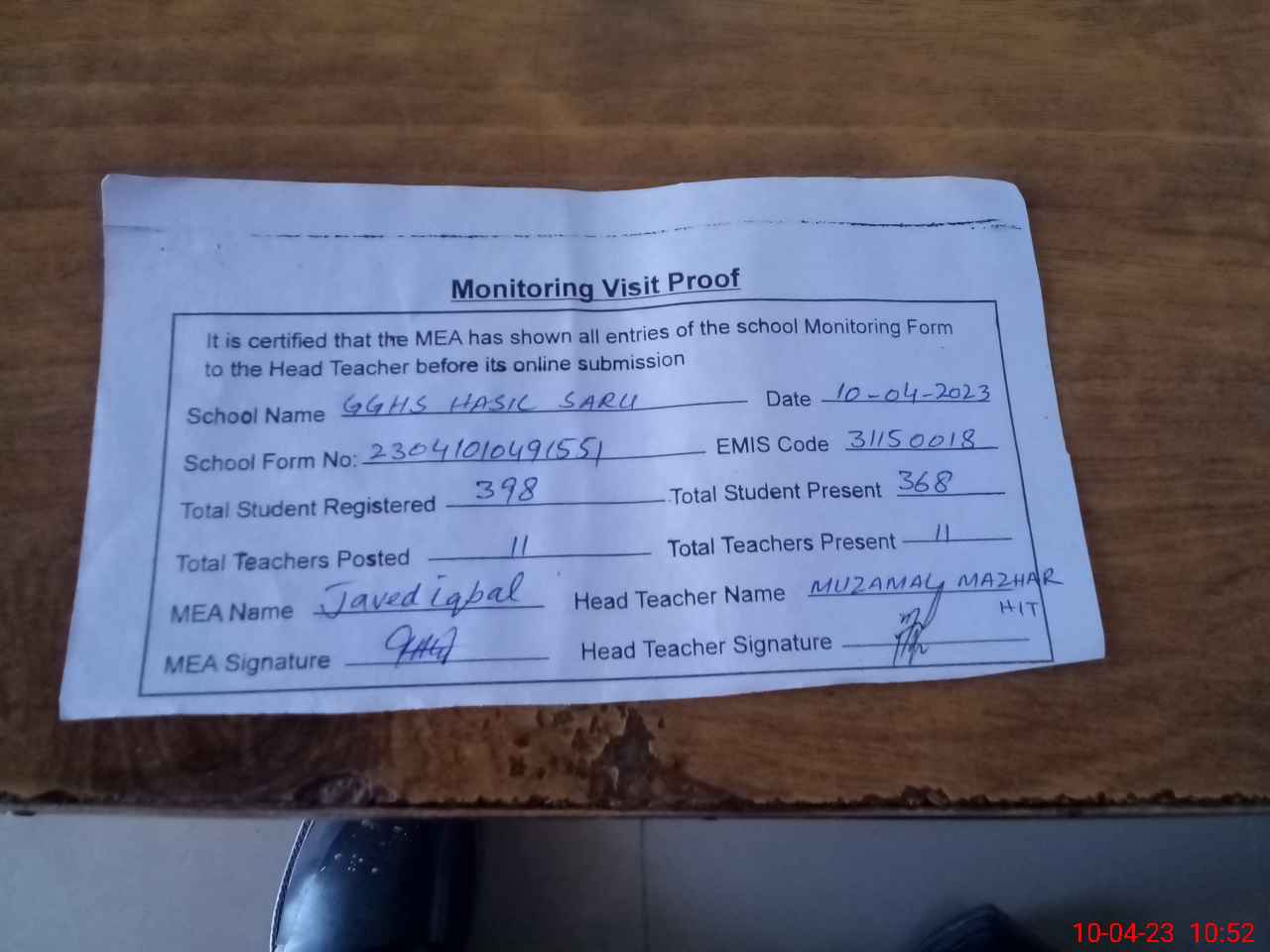 | Monitoring Date: 10-04-2023 | Start Time: 10-04-2023 10:21 AM | End Time: 10-04-2023 10:59 AM | Name of MEA: Ja**** Iq**** BN**** | |
