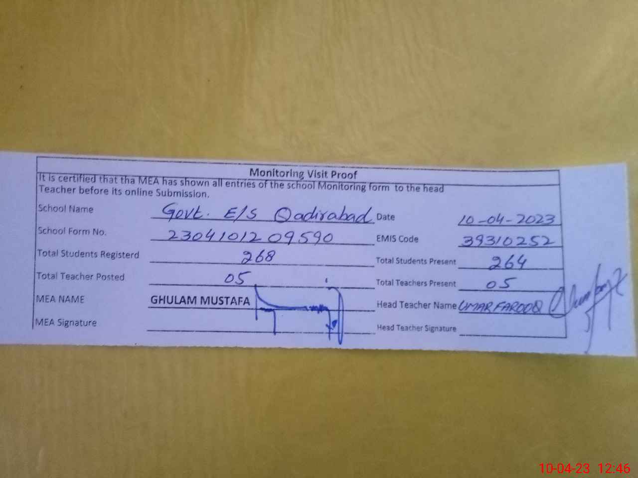 | Attendance Register | Head Teacher | MEA with School | Visit Proof |
