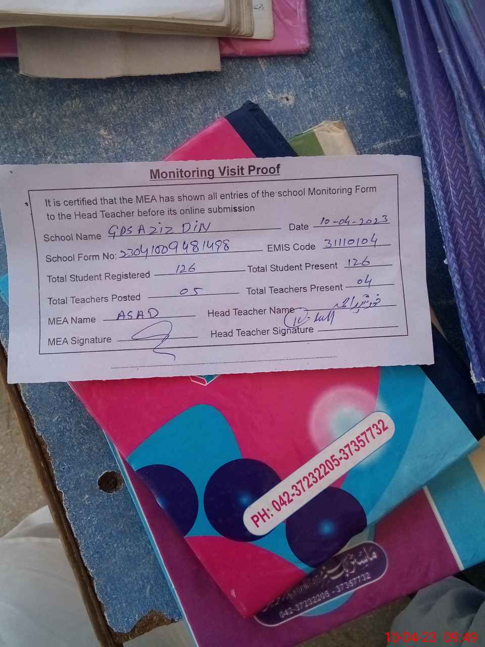 | EMIS Code: 31110104 | Name of School: GPS AZIZ DIN | |||