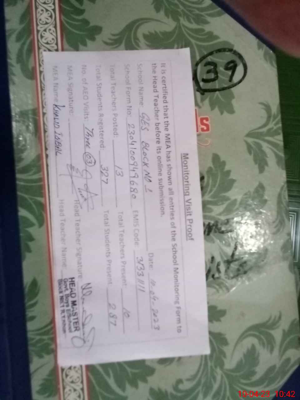 | Attendance Register | Head Teacher | MEA with School | Visit Proof |