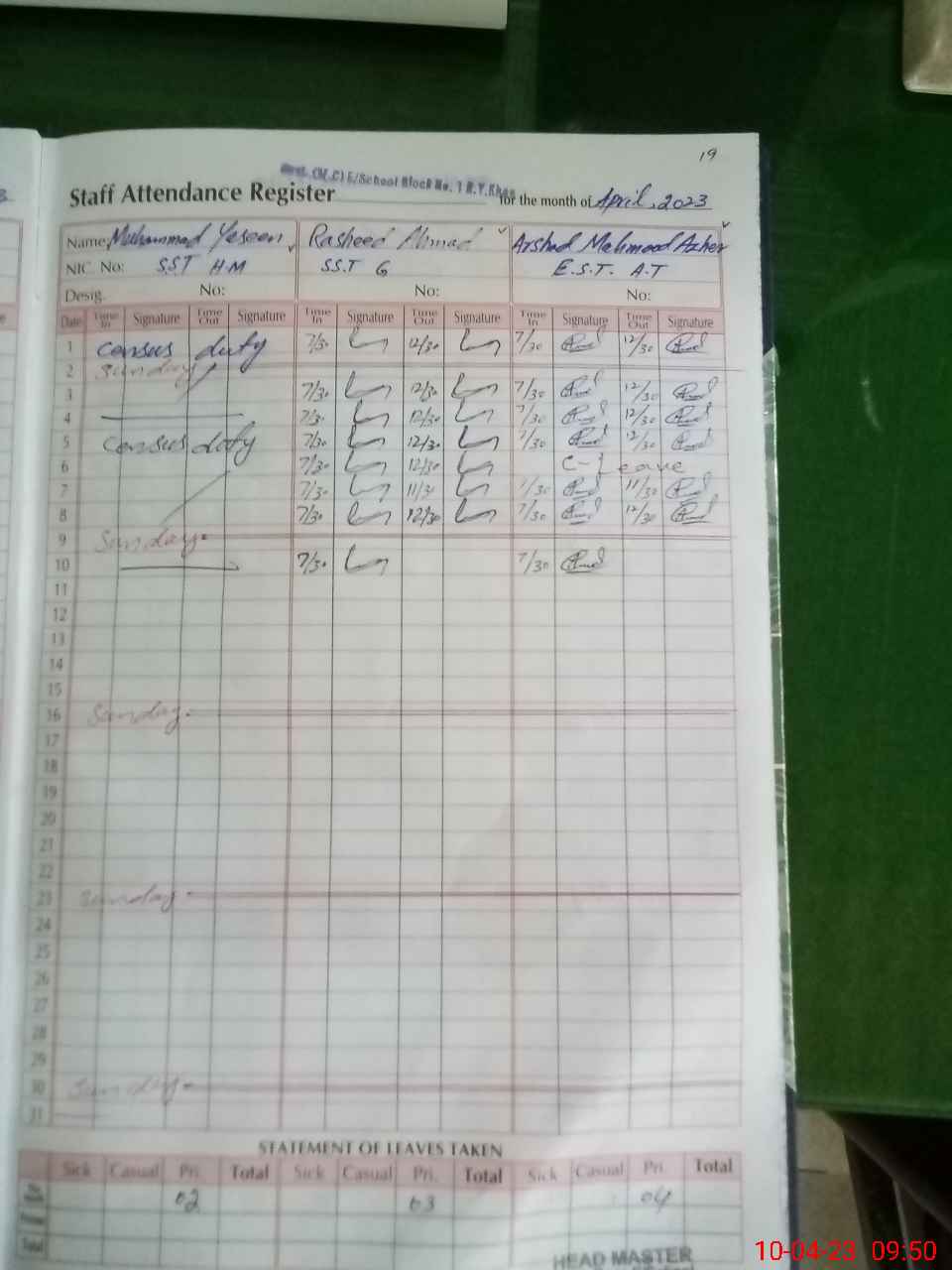 | CNIC | Full Name | Designation | R/C | Absence During Last Calender Month |