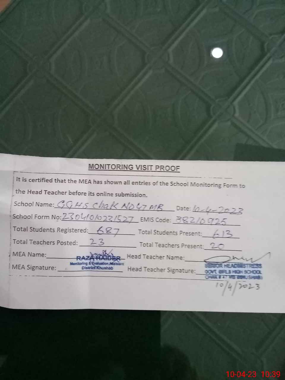 | EMIS Code: 38210925 | Name of School: GGHS CHAK NO 47 MB | |||