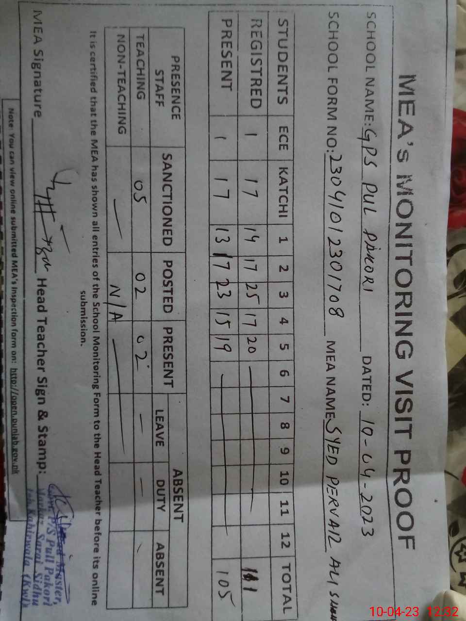 | Attendance Register | Head Teacher | MEA with School | Visit Proof |