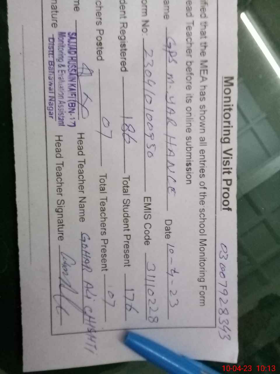 | Name: Mu**** Ya**** Designation: (School Headmaster's/Headmistress's) PST Phone/Cell Number: 03**** |