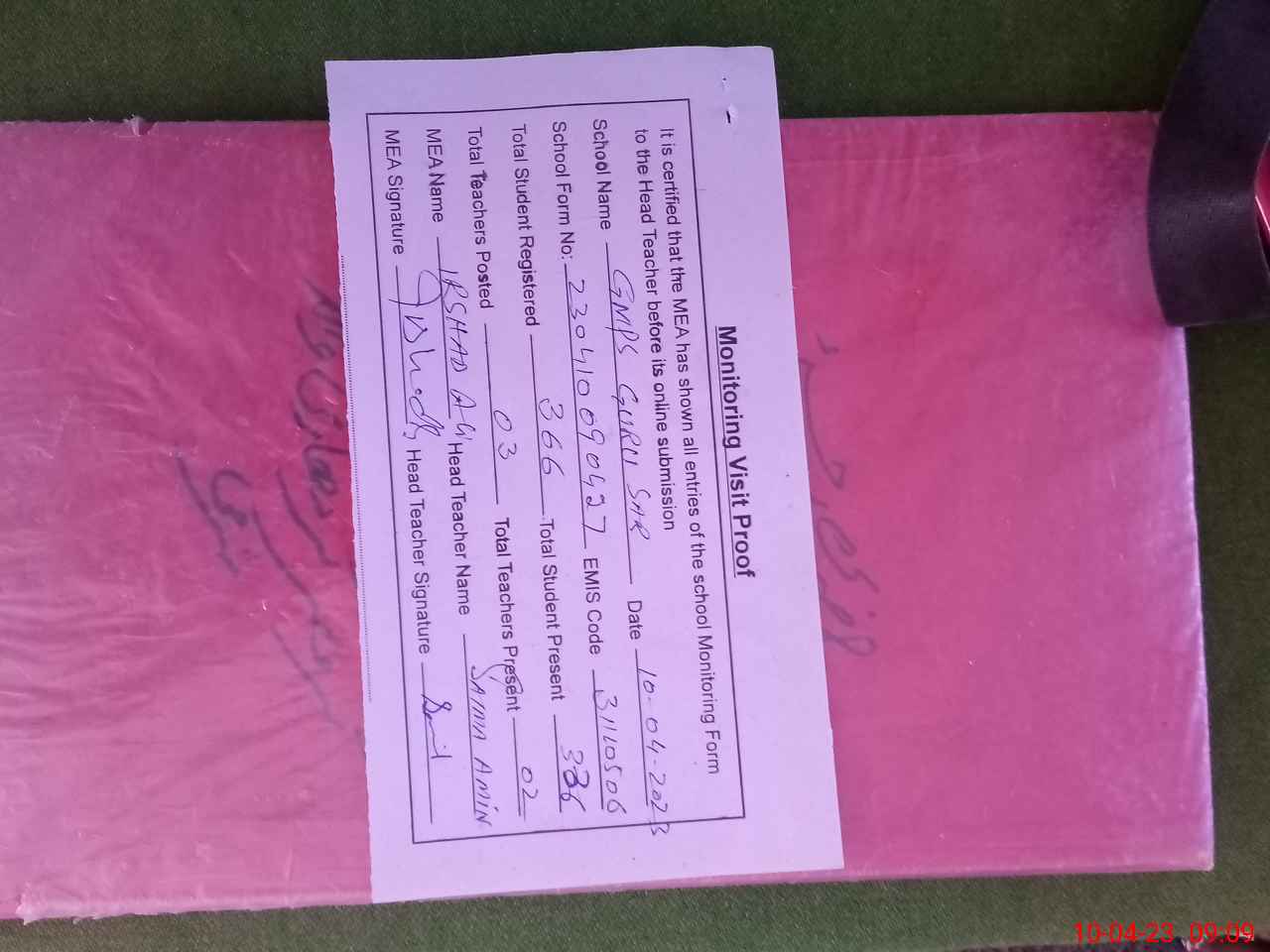 | Attendance Register | Head Teacher | MEA with School | Visit Proof |