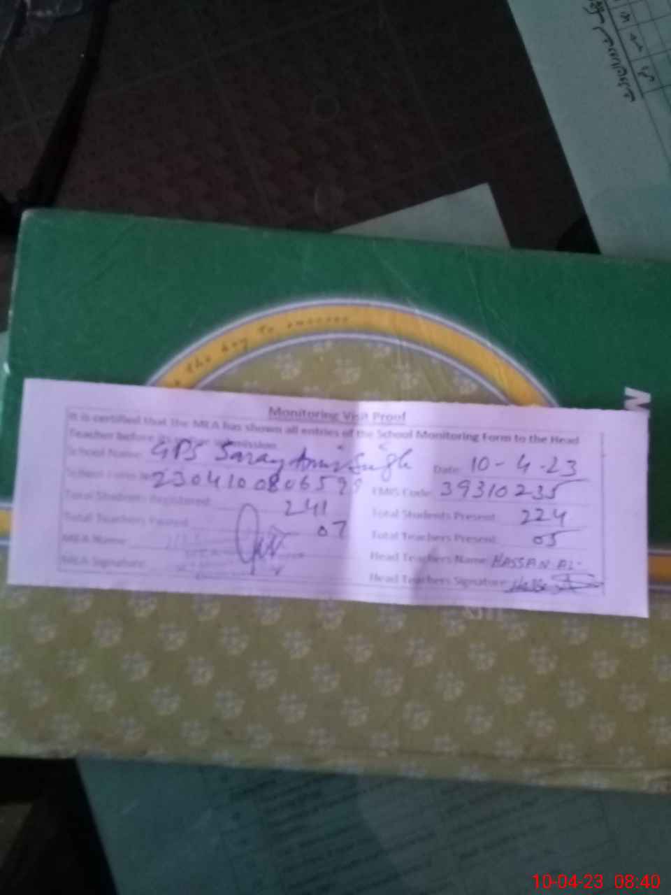| Attendance Register | Head Teacher | MEA with School | Visit Proof |